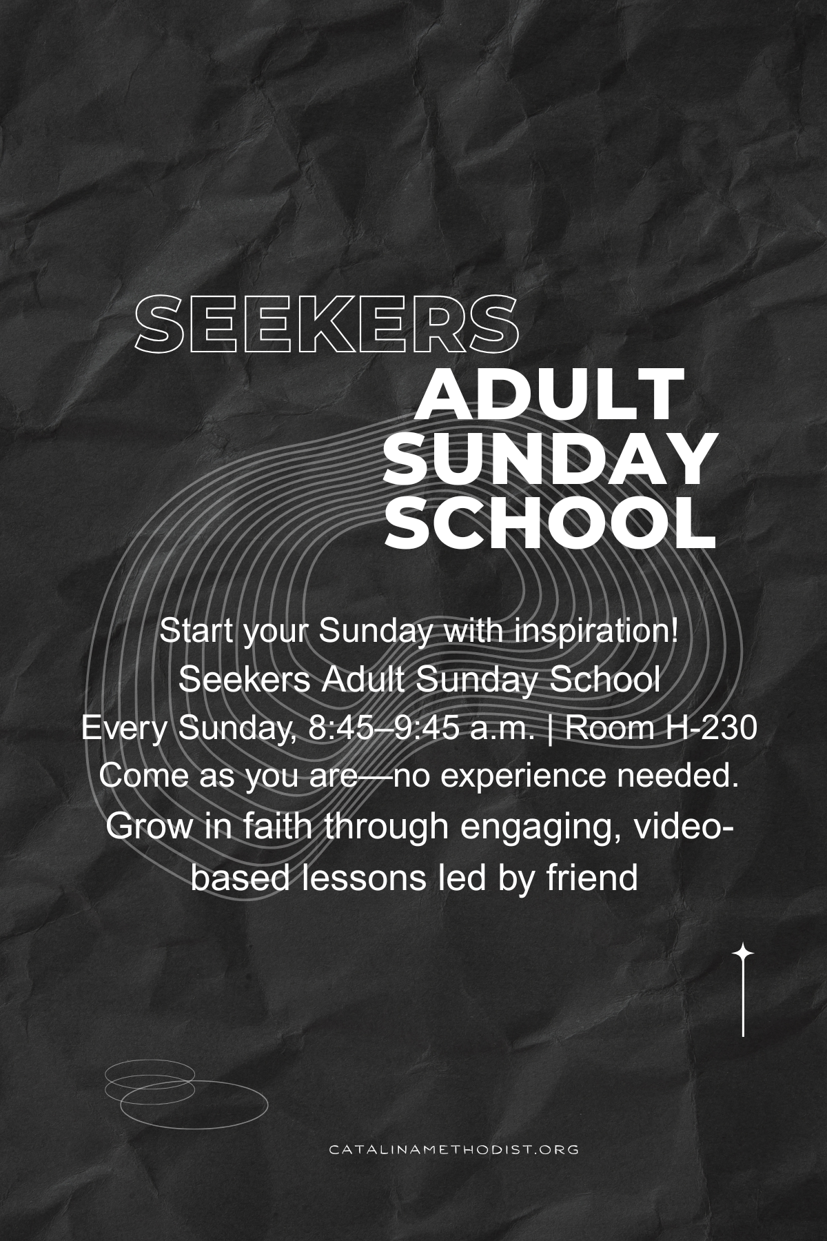 Seekers Adult Sunday School Class @ 8:45am-9:45am in Room H-230 A desire to enrich your understanding and faith is the only requirement. Join us for a variety of video-based lessons led by volunteer class members. For lesson schedule click here: https://www.catalinamethodist.org/adults/.
