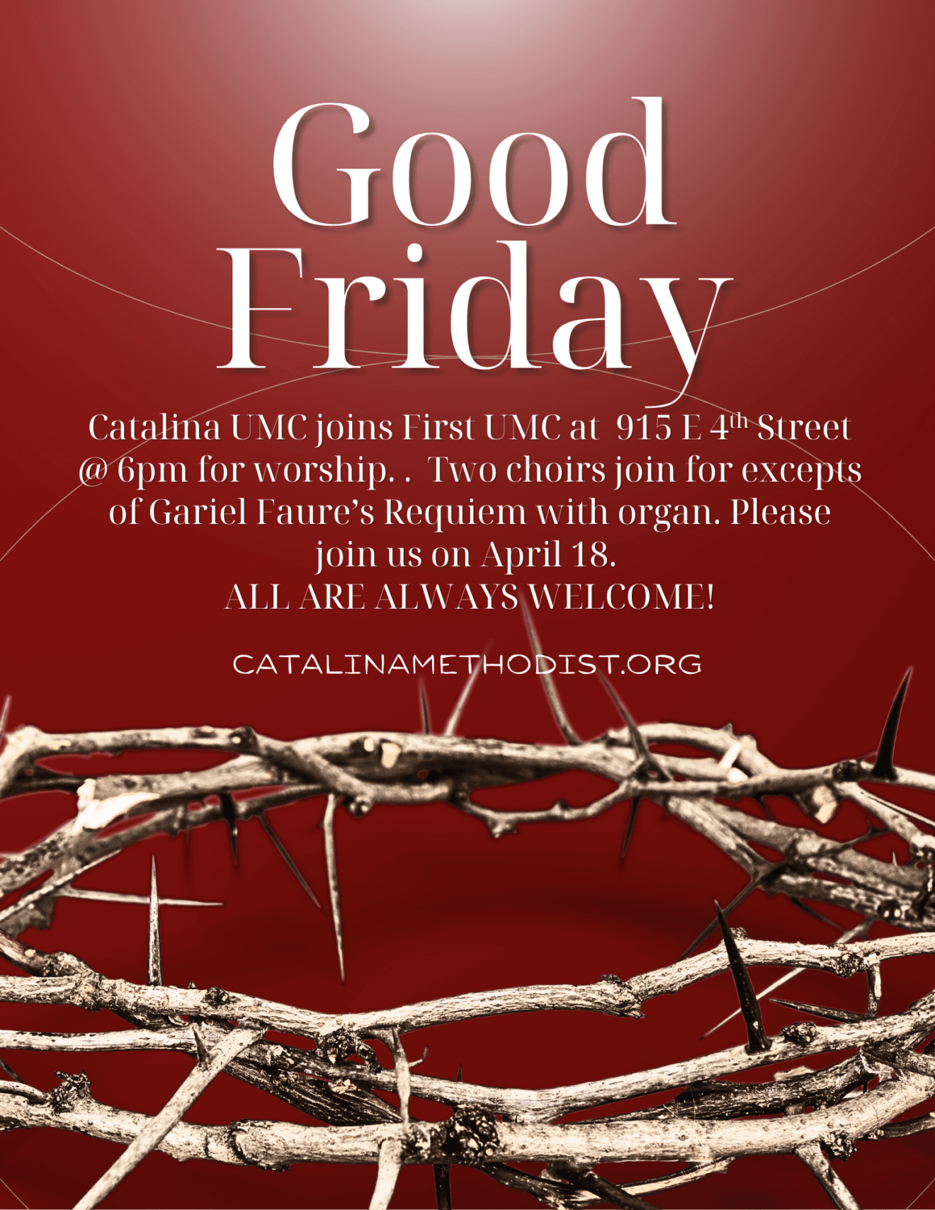 Good Friday, 6pm at First UMC, 915 E 4th Street